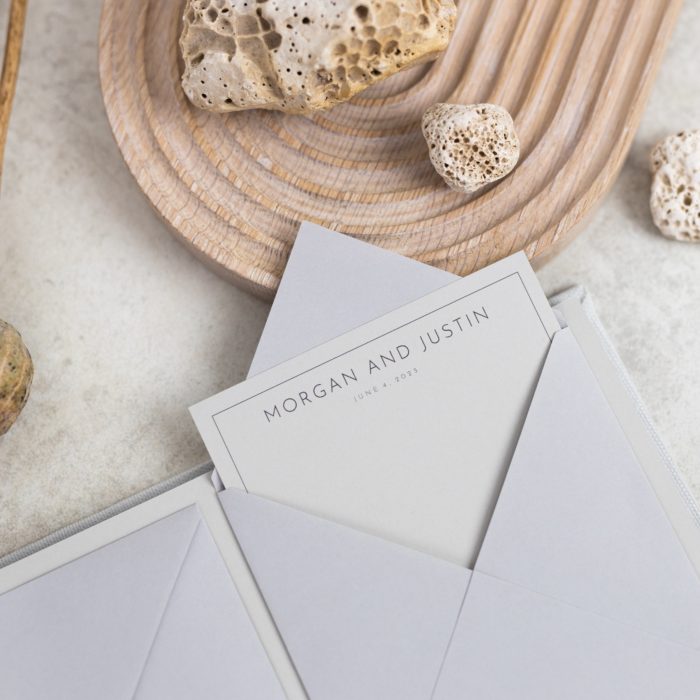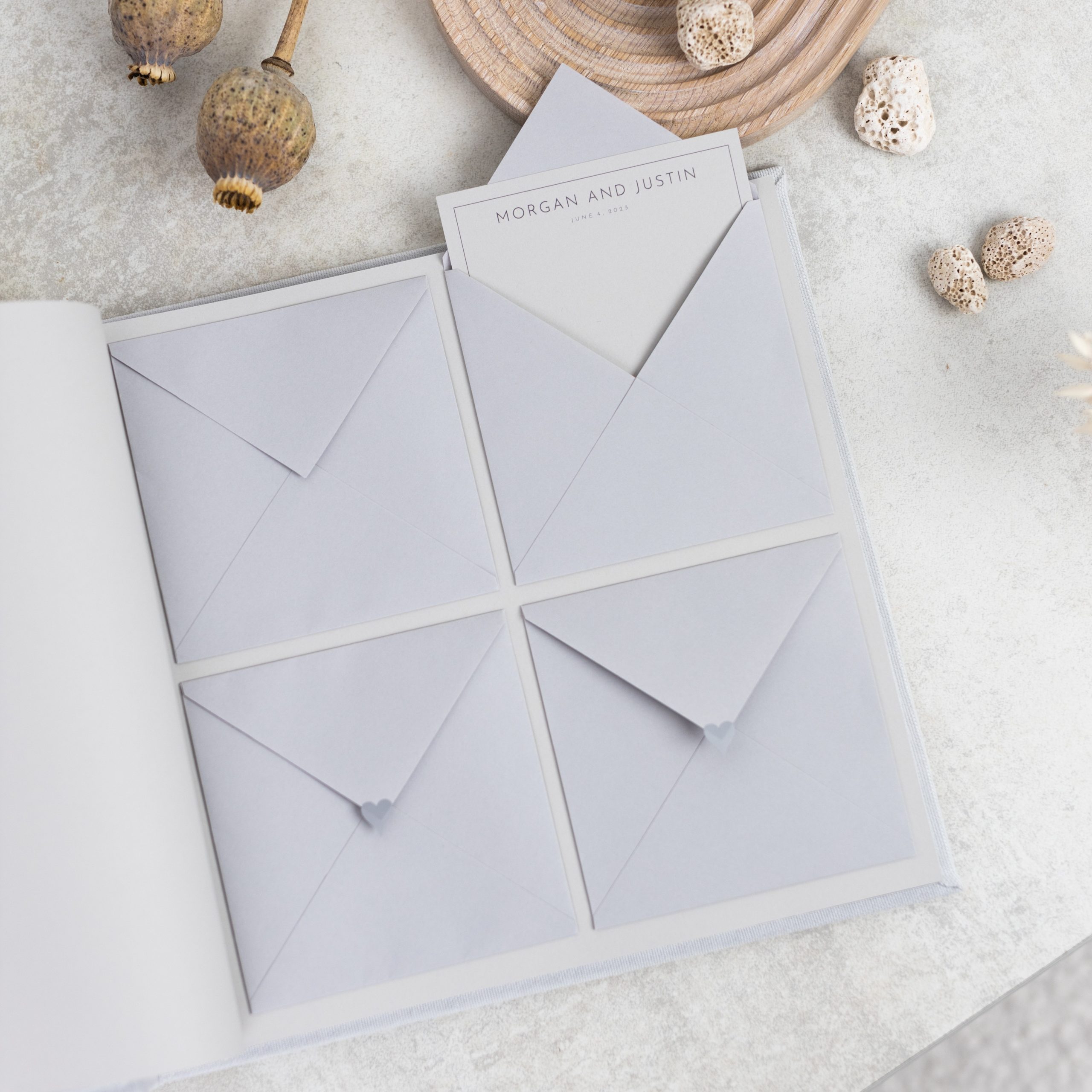 A minimalist guestbook with envelopes and personalised cards – a stylish way for guests to write their wishes. The handmade envelopes are designed to fit snapshots. So these books are also a great choice for those who will be using instant cameras at the party.